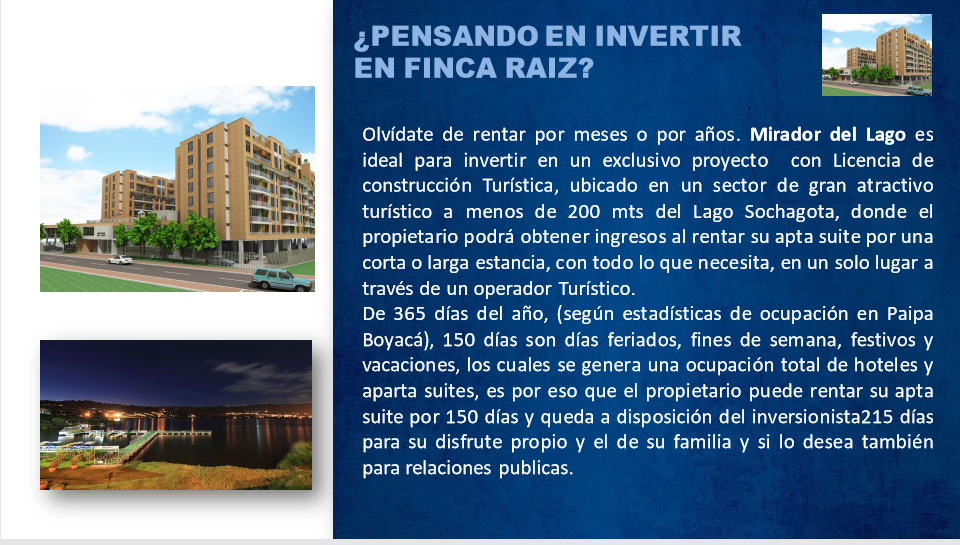 PROYECTO MIRADOR DEL LAGO. Paipa Boyaca. Colombia.GRAN OPORTUNIDAD DE INVERSIÓN.APARTA SUITES TURÍSTICOS Y RENTABLES.